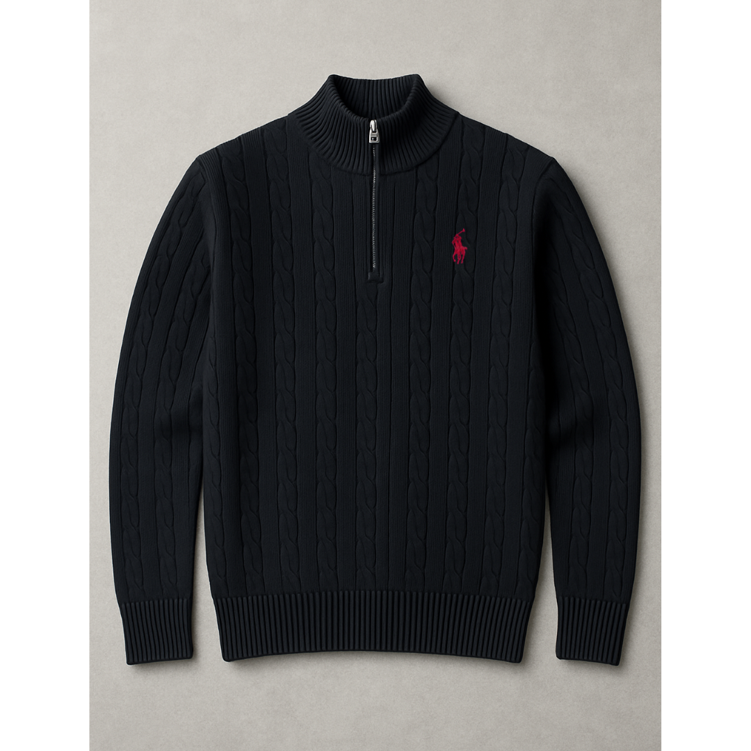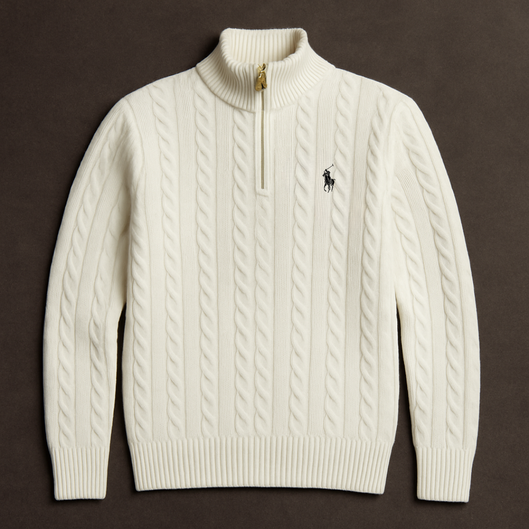 Ce pull écru à col montant zippé incarne l’élégance intemporelle. Confectionné dans une maille torsadée épaisse, il offre un confort exceptionnel et un look raffiné. Le zip métallique doré apporte une touche de sophistication, tandis que les finitions côtelées au col, aux poignets et à l’ourlet assurent une tenue impeccable. Le logo brodé sur la poitrine ajoute une signature classique et discrète. Parfait pour l’hiver, ce pull allie chaleur, style et qualité premium.