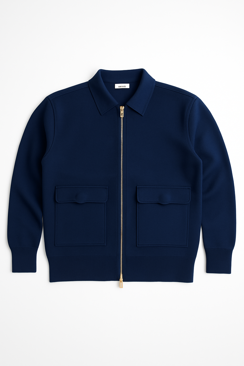 Veste bleu marine élégante avec zip doré et poches avant à rabat. Style minimaliste, moderne et sophistiqué.